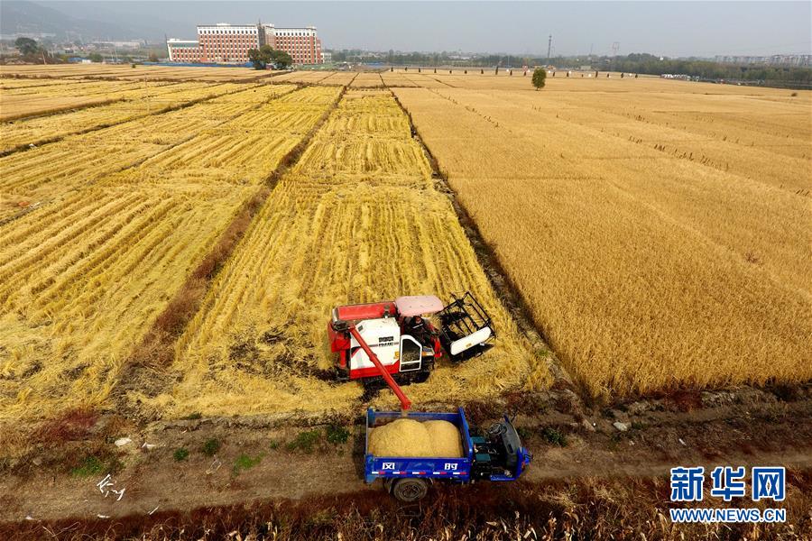 在太原市晋源区赤桥村,收割机在稻田里作业(10月17日无人机拍摄)。近日,山西省太原市晋源区2000多亩水稻迎来收割季。 金秋时节,农民们忙着收获成熟的农作物,喜迎丰收。 新华社记者 詹彦 摄