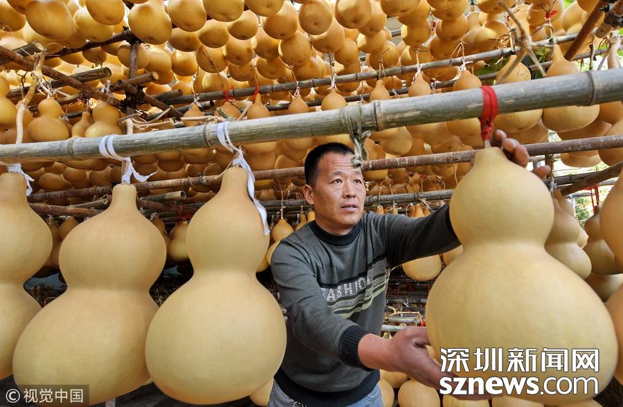 山西闻喜县礼元镇阜底村农民赵双慧在晾晒丰收的葫芦。