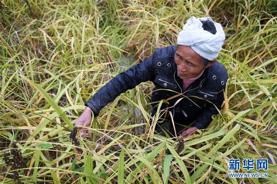 10月17日,在贵州省黔东南苗族侗族自治州从江县高增乡占里村,村民在收割香禾糯稻谷。 金秋时节,农民们忙着收获成熟的农作物,喜迎丰收。 新华社记者陈晔华摄