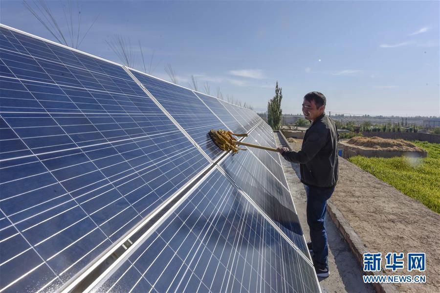 在新疆哈密市伊州区回城乡铁木尔提村,村民潘林琪打扫自家房顶上的太阳能发电板(2018年9月21日摄)。今年以来,新疆稳步推进新能源参与“疆电外送”、扩大与燃煤自备电厂调峰替代交易等多种电力交易方式,着力破解“绿色电力”上网难题,新能源发电量同比增加近13个百分点,而弃电量和弃电比实现“双降”,绿色发展理念进一步落实。新疆是我国重要的能源供应和储备基地,风能、太阳能储量丰富。近年来,新疆新能源装机总量突破2700万千瓦,规模和占比均居全国前列。新华社记者 赵戈 摄