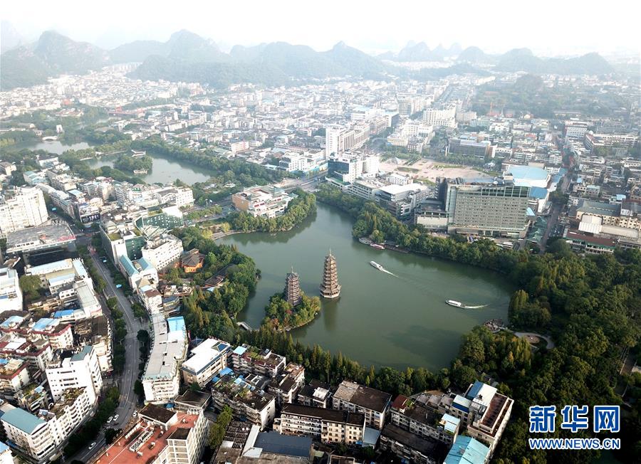 游船在广西桂林市杉湖湖面上穿行(10月17日无人机拍摄)。 江作青罗带,山如碧玉簪。1100多年前,唐朝诗人韩愈写尽桂林山水之美。千百年来,桂林的青山绿水成为历朝历代文人骚客笔下的“人间仙境”。 保护好桂林山水,既是对祖国大好河山负责,更是对历史负责。近年来,尤其是党的十八大以来,桂林严守生态底线,以前所未有的力度截污治河,保护漓江最美山水,推动城乡统筹协调发展,不断扩大对外开放合作力度,努力在青山绿水里走出一条生态文明路。 新华社记者 周华 摄