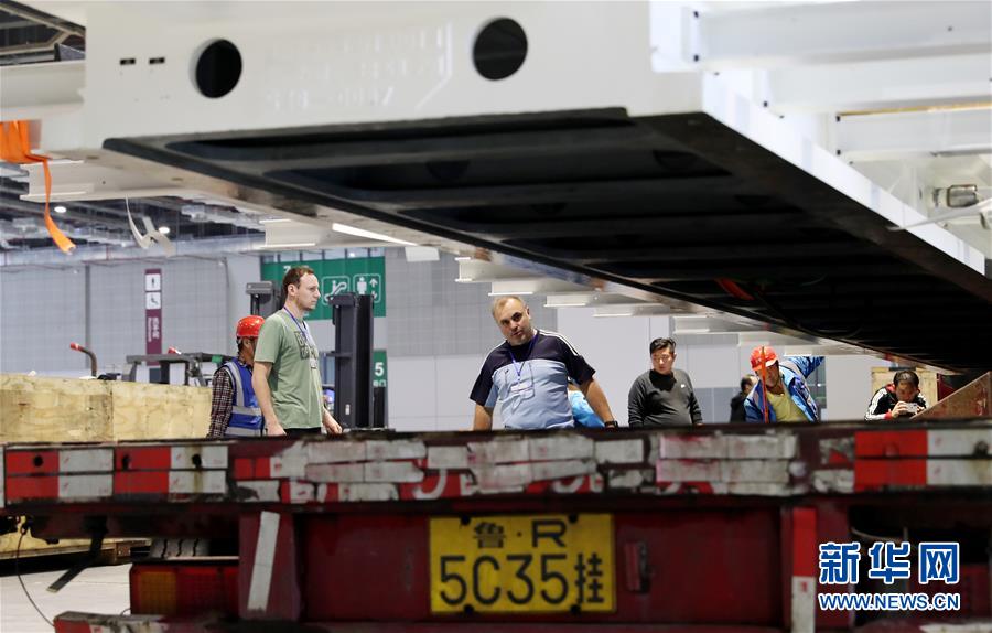 10月22日,德国工程师马丁·霍尔茨海德(中)在吊装过程中查看“金牛座”龙门铣床床身位置。 当日,来自德国的首届进口博览会最大展品——“金牛座”龙门铣床完成初步组装,将运往国家会展中心(上海)3号馆进行最后的安装施工。这是德国瓦德里希科堡公司研发的机床设备,高约8米,占地面积约200平方米,将在智能及高端装备区进行展出。 新华社记者方喆摄