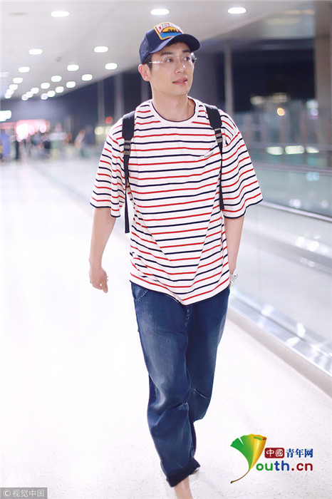 2018年10月22日,上海,朱亚文现身机场。他头戴棒球帽,身穿条纹短袖搭配休闲哈伦裤显得年轻又时尚,立减十岁大叔变潮男,单手插袋抿嘴略显痞气。