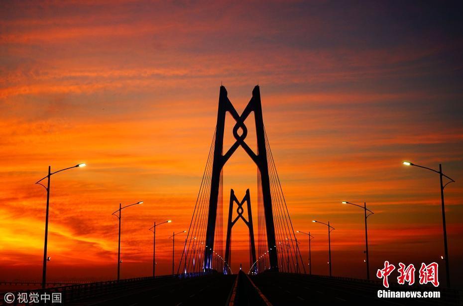 2018年7月18日,珠海,满天红霞,亮灯后的港珠澳大桥跨立在伶仃洋上,进入通车前的最后准备。张由琼 摄 图片来源:视觉中国