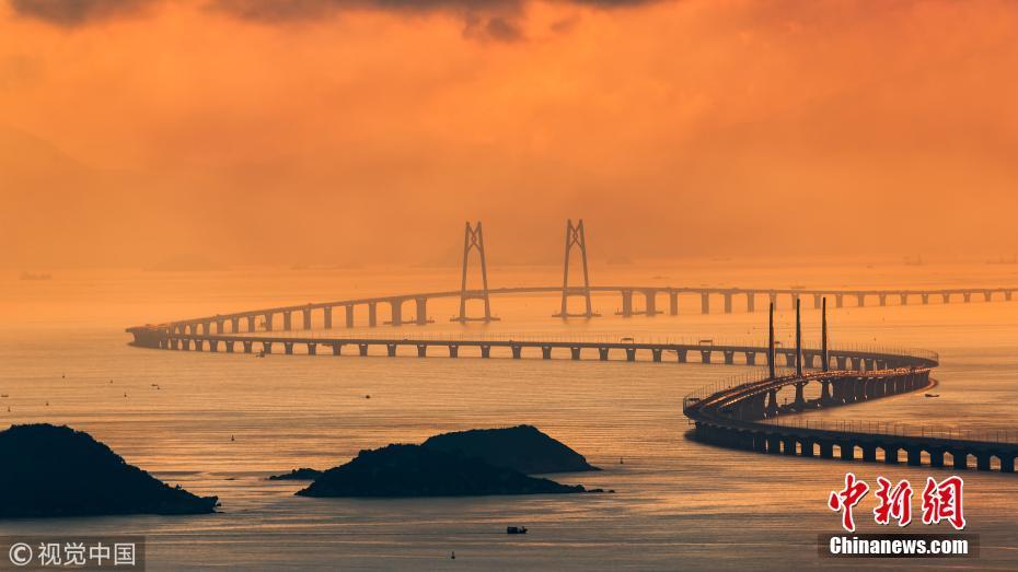 2018年5月21日,广东珠海,太阳从香港大屿山慢慢升起,港珠澳大桥犹如一条巨龙蜿蜒盘绕在海面上。