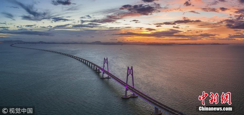 2018年7月18日,珠海,满天红霞,亮灯后的港珠澳大桥跨立在伶仃洋上,进入通车前的最后准备。张由琼 摄 图片来源:视觉中国