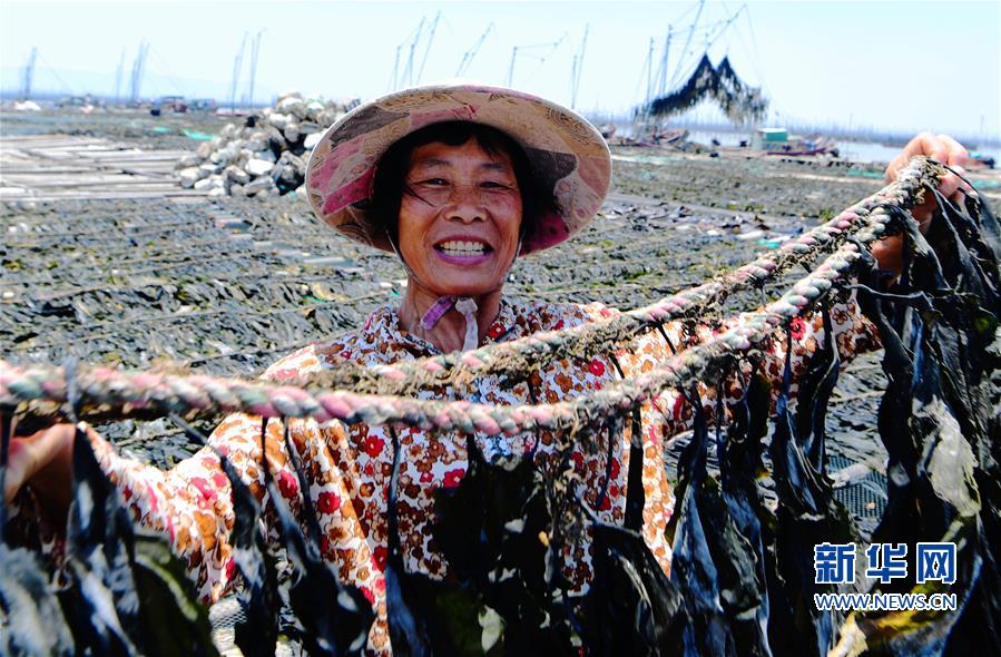 5月17日,在霞浦县沙江镇沙江村码头,养殖户在晾晒海带。