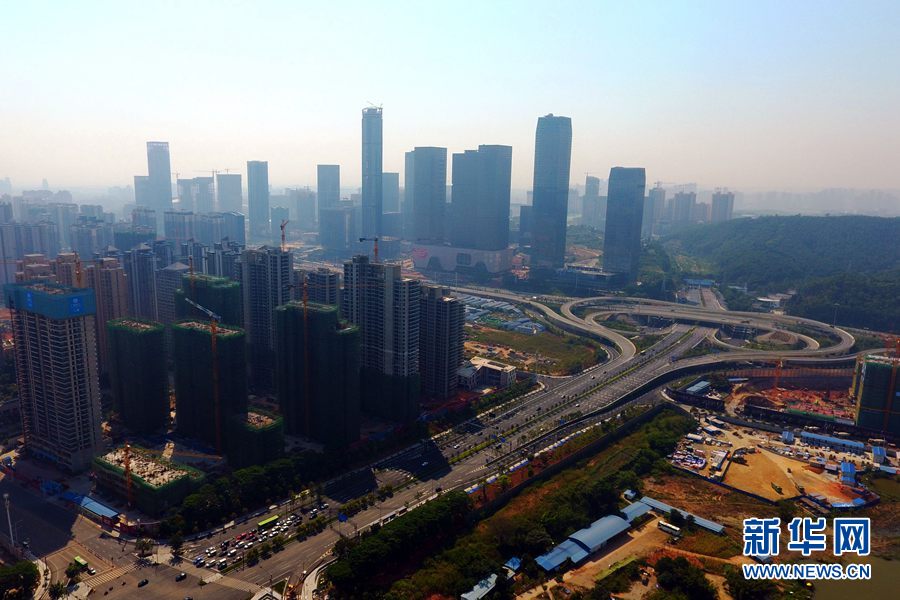 广西南宁五象新区地处邕江之南,东起八尺江,西邻水塘江,北起邕江,南望滨海,规划面积约200平方公里。新区将规划建设成为南宁市构建区域性商贸物流基地、先进制造业基地、面向东盟的大型企业总部基地及文化交流展示合作的重要枢纽、信息中心及金融中心的重要支撑的现代新城。图为无人机航拍建设中的五象新区(摄于2018年10月7日)。新华网发 韦秀玲摄