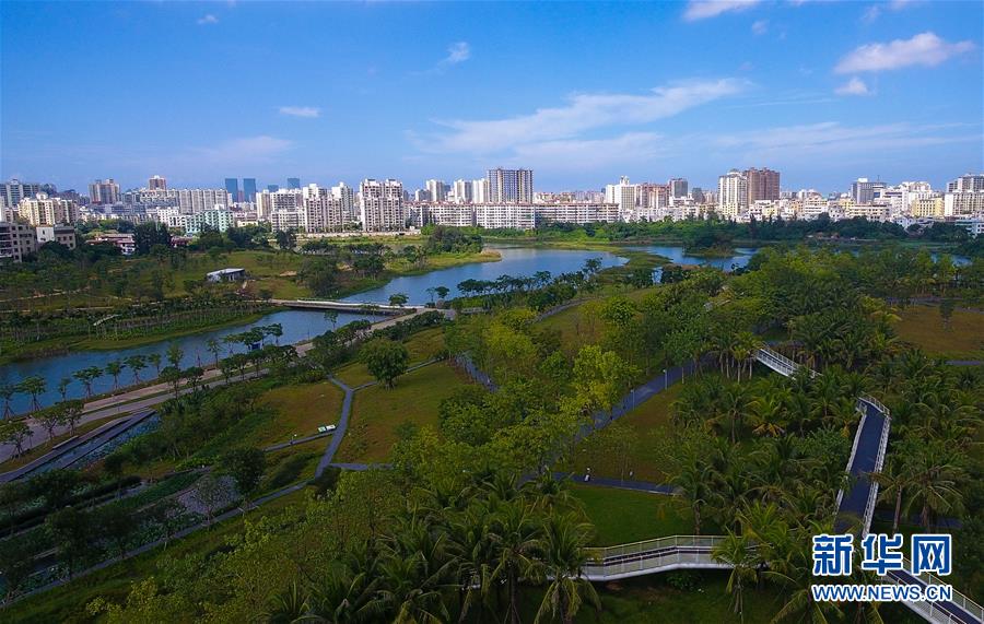 这是海口市美舍河凤翔湿地公园一角(10月22日无人机拍摄)。 海口市凤翔湿地公园内流水潺潺,绿草如茵。很难想象,这个市民游客休闲散步的好去处、具有强大污水净化功能的湿地公园,两年前还是臭气熏天、人们避之不及的垃圾堆填场。 把生态文明建设放到更加突出的位置,近两年来海口市以湿地城市建设为突破口,不断创新城市生态治理,着力改善生态民生,在生态文明建设上闯关探路。 新华社记者 杨冠宇 摄