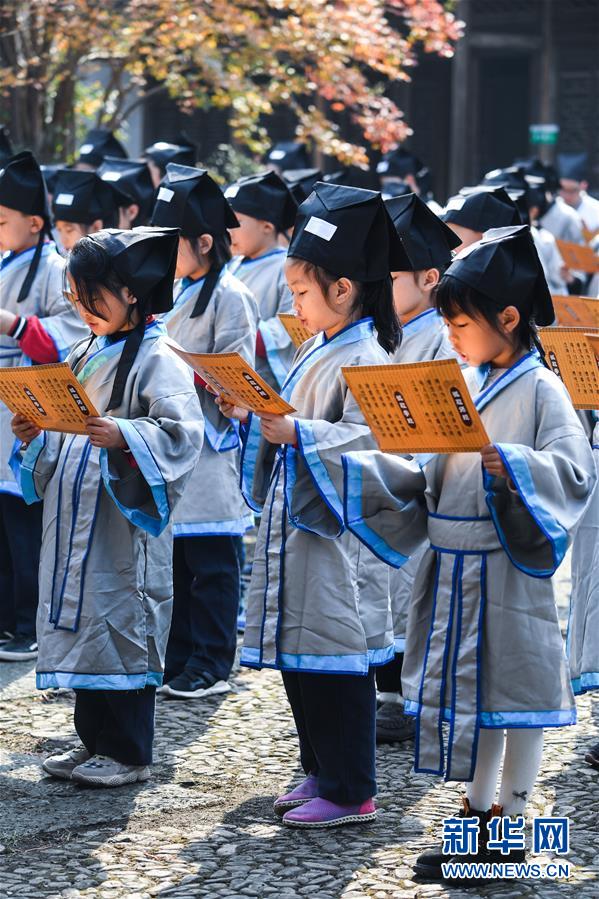 10月23日,学生们在诵读国学经典。当日,浙江省长兴县第八小学举行“诵家规家训,传中华美德”校园“诚敬日”主题教育活动,通过诵读国学经典、讲励志故事、演美德戏剧等形式,让学生感受优秀传统文化。近年来,该学校立足“诚敬”文化,注重国学启蒙教育,让学生从小培养“以诚立身、以敬处事”的良好品质。新华社记者 徐昱 摄