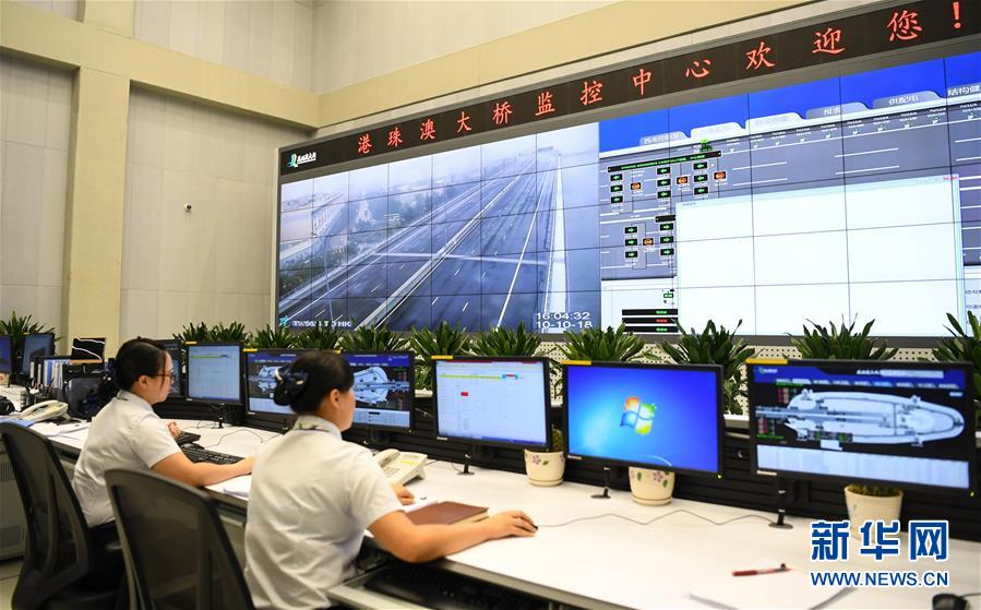 港珠澳大桥监控中心(2018年10月10日摄)。 金秋十月,伶仃洋上海天一色、潮声阵阵,依傍着这片中国南海水域的城市群迎来深具意义的一天。 10月23日上午,港珠澳大桥开通仪式在广东珠海举行,中共中央总书记、国家主席、中央军委主席习近平出席仪式,宣布大桥正式开通。 碧波之上,一桥飞架香港、澳门、珠海三地,以气贯长虹的“中国跨度”,飞越沧海百年的历史风云,展现当代中国的雄健风采。 新华社记者邓华摄