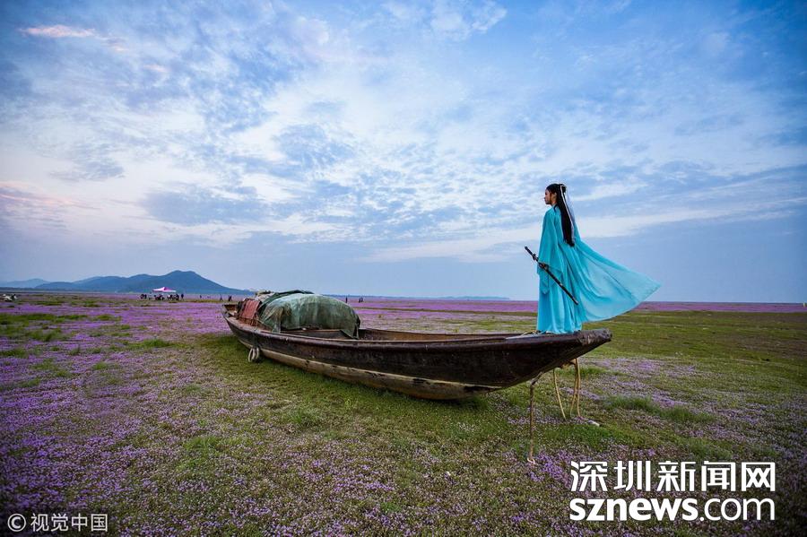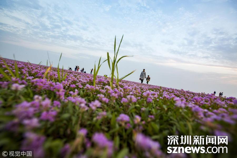 深圳新闻网讯 2018年10月23日,南昌,游人在江西鄱阳湖都昌湿地蓼子花海内游玩。连日来,中国第一大淡水湖江西鄱阳湖湿地大面积蓼子花开放,秋景宜人,紫色的花海吸引大批游客前来赏景游玩。