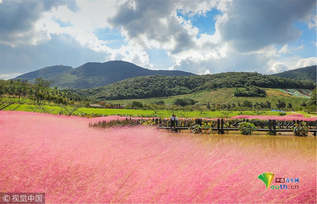 中国青年网北京10月7日电 2018年10月6日,游客在“粉色田野”里游玩、留影。粉黛乱子草是一种观赏草种,该植物夏季为主要生长季,全株绿色,花期为9月中旬至11月中旬,开花时,绿叶为底,粉紫色花穗如发丝从基部长出,远看如红色云雾。