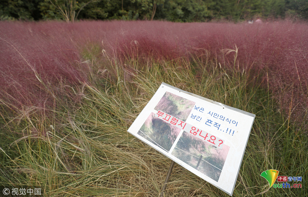当地时间2018年10月16日,韩国蔚山,近日,蔚山公园大片粉黛乱子草盛开,粉红花海浪漫十足,但部分花海遭游客随意踩踏。公园并没有修复遭破坏区域,而是用绳索围起并挂上批判性告示,呼吁游客脚下留情。图片作者:Yonhap News Agency