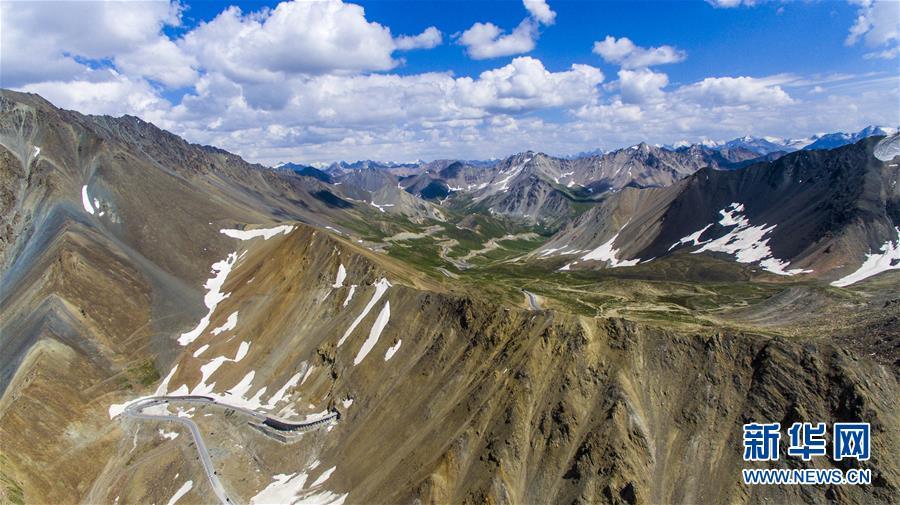 独库公路穿越海拔3390米的哈希勒根达坂(2017年7月13日无人机拍摄)。 新华社记者 江文耀 摄