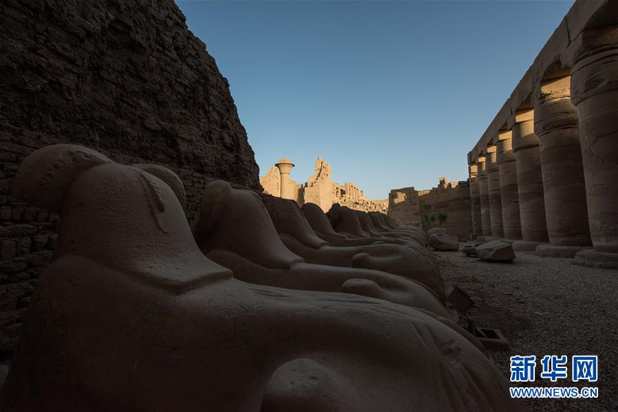 这是10月23日在埃及卢克索拍摄的卡纳克神庙内的石柱与雕像。新华社记者 孟涛 摄