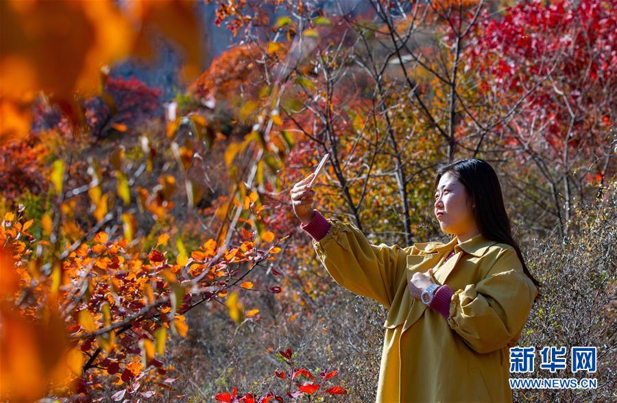 10月24日,游客在河北省武安市贺进镇后临河村拍照留念。 金秋时节,位于太行山区的河北省武安市贺进镇后临河村的红叶进入观赏佳期。 新华社记者 王晓 摄