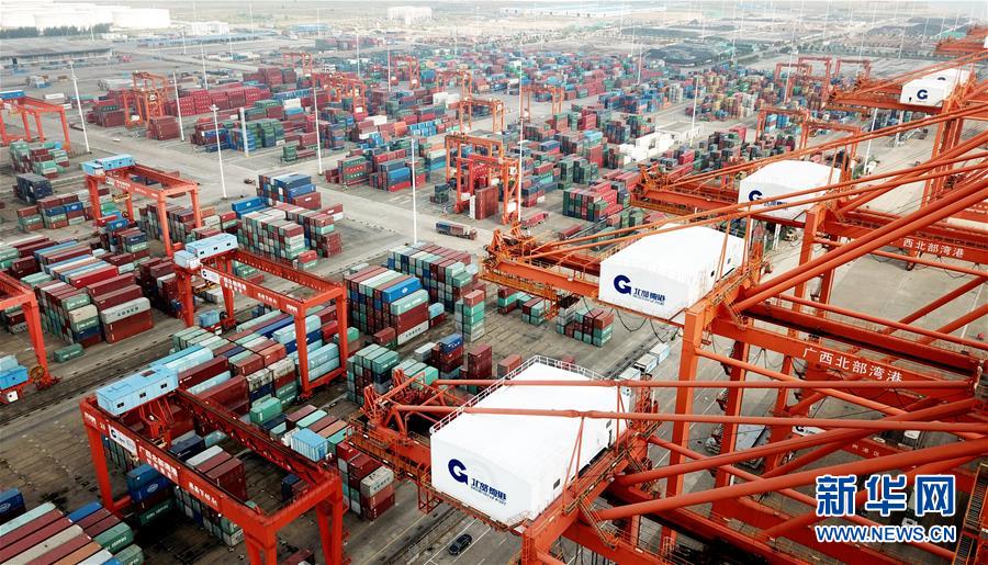 这是广西钦州保税港区码头,钦州港是北部湾地区最大的集装箱运输港(10月23日无人机拍摄)。 新华社记者 魏海 摄