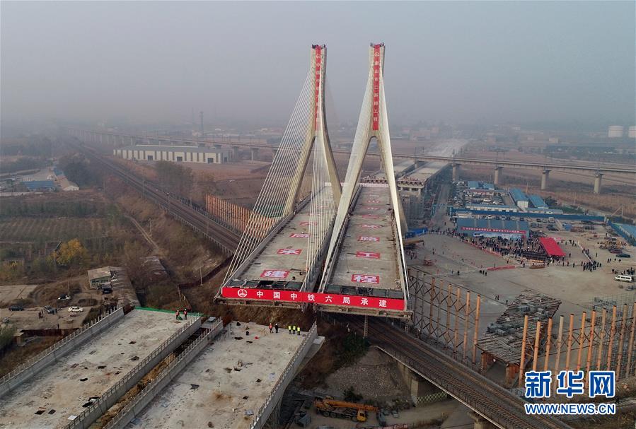 这是郑万高铁跨徐兰高铁成功转体后的场景(10月24日无人机拍摄)。 新华社记者朱祥摄