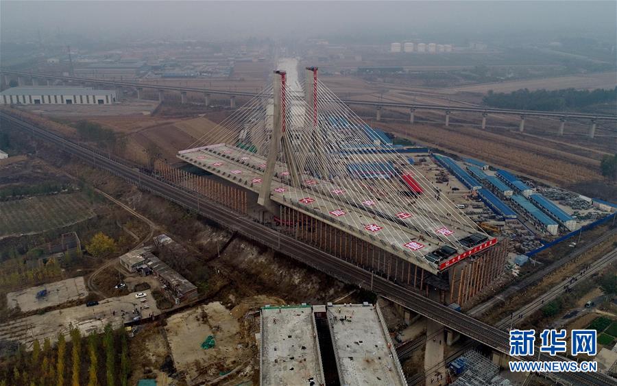 10月25日,唐山市二环路项目上跨津山铁路斜拉桥在转体中(无人机拍摄)。 当日,河北省唐山市二环路项目上跨津山铁路斜拉桥转体成功。据介绍,该桥总长927.5米,主桥由斜拉转体桥和转体T构桥组成,转体总重5.1万吨,其中斜拉转体桥重3.3万吨,主塔高达80.5米,为曲线变截面“双人字”形空心塔,自上而下共有128根斜拉索。 新华社记者杨世尧摄