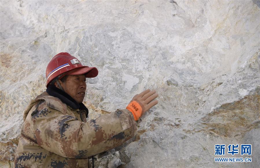 在昆仑山上海拔4000米的兴发达玉矿,工程师田仲祥展示一块正在开采的玉石矿体(10月23日摄)。 新华社记者武巍摄