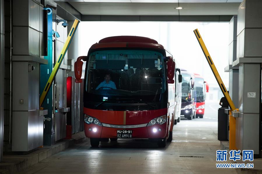 10月24日,跨境巴士在澳门口岸离境车道上通关。当日9时,港珠澳大桥正式通车。 新华社记者张金加摄
