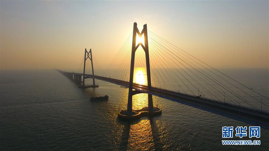 清晨的阳光穿过港珠澳大桥“中国结”桥塔(2017年12月27日无人机拍摄)。 金秋十月,伶仃洋上海天一色、潮声阵阵,依傍着这片中国南海水域的城市群迎来深具意义的一天。 10月23日上午,港珠澳大桥开通仪式在广东珠海举行,中共中央总书记、国家主席、中央军委主席习近平出席仪式,宣布大桥正式开通。 碧波之上,一桥飞架香港、澳门、珠海三地,以气贯长虹的“中国跨度”,飞越沧海百年的历史风云,展现当代中国的雄健风采。 新华社记者梁旭摄