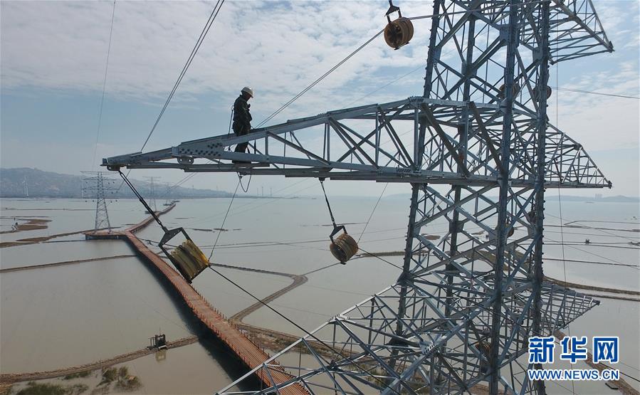 10月25日,埭头风电送出工程施工人员在跨平海湾段的铁塔上作业(无人机拍摄)。 新华社记者林善传摄