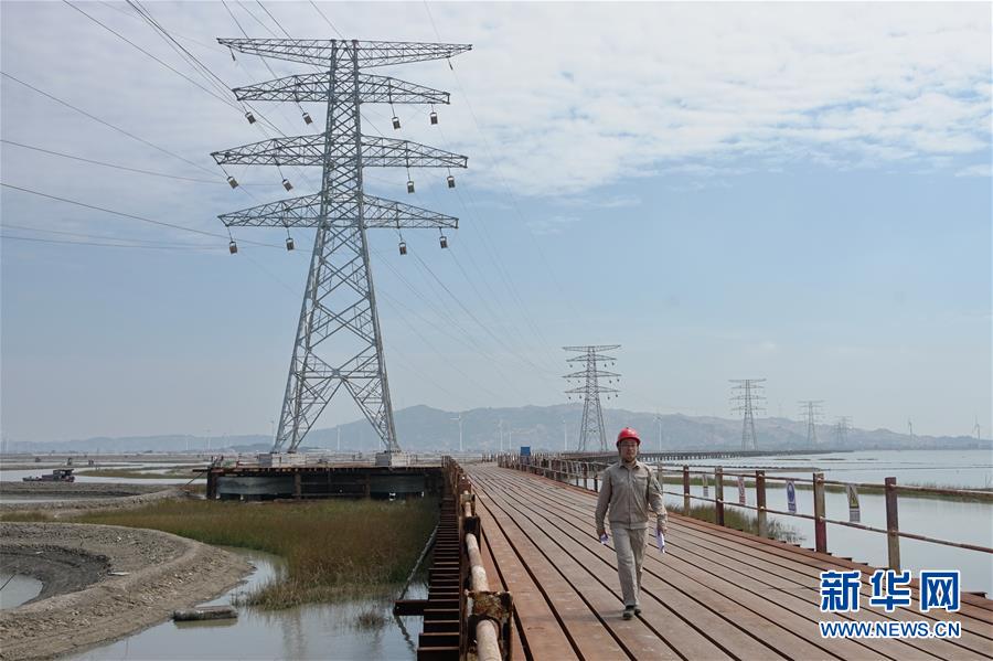 10月25日,施工人员从莆田埭头风电220千伏送出工程横跨平海湾的全路径栈桥上通过。 新华社记者林善传摄