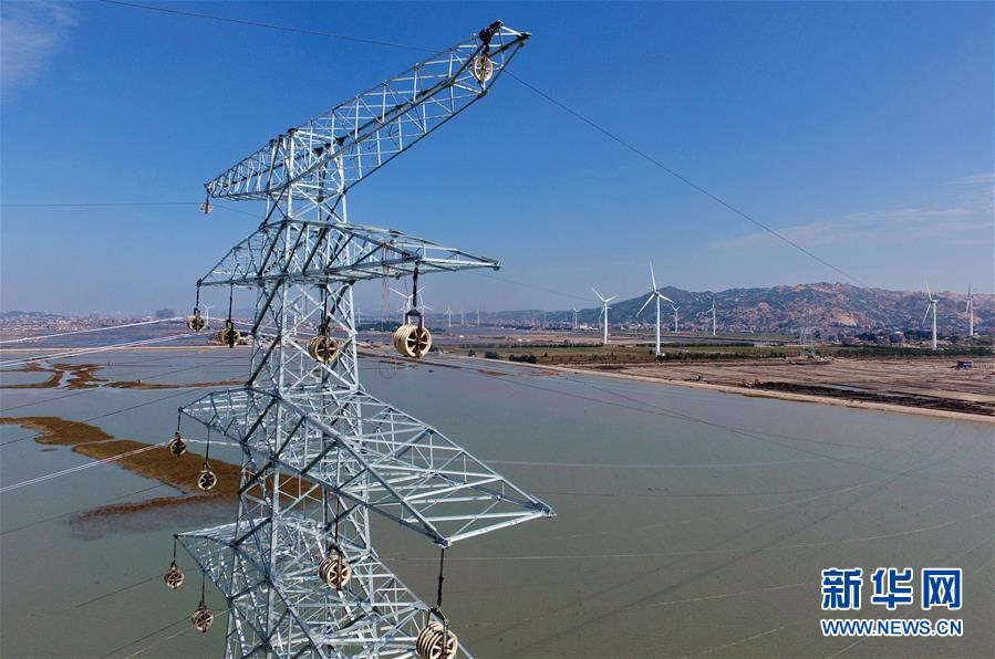 这是建在莆田平海湾上开始架线的输送风电铁塔和远处的东峤风力发电场(10月25日无人机拍摄)。 新华社记者林善传摄