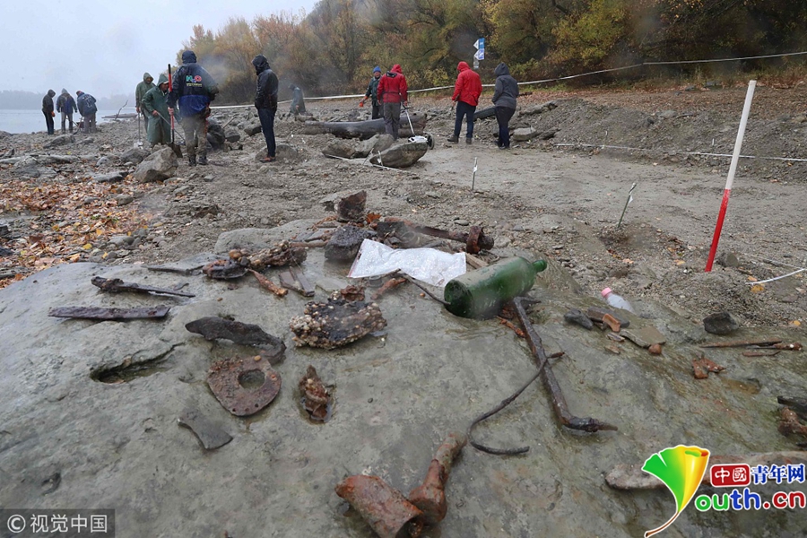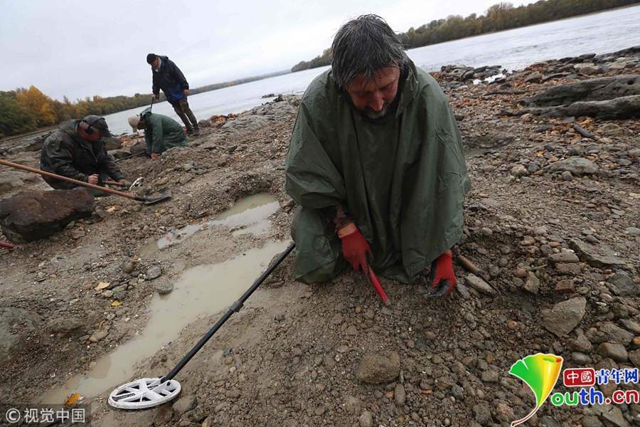 当地时间2018年10月25日,匈牙利布达佩斯,由于水位下降,考古学家在多瑙河畔发掘出大量16-17世纪古钱币和武器。据现场工作的考古学家说,这些宝藏来自一艘可能在18世纪沉没的商船。
