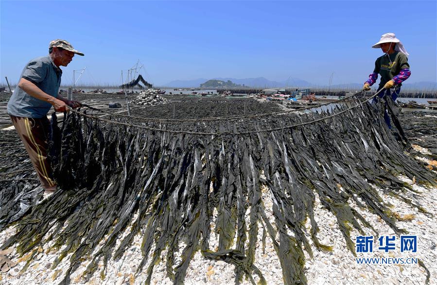 5月17日,在霞浦县沙江镇沙江村码头,养殖户在晾晒海带。
