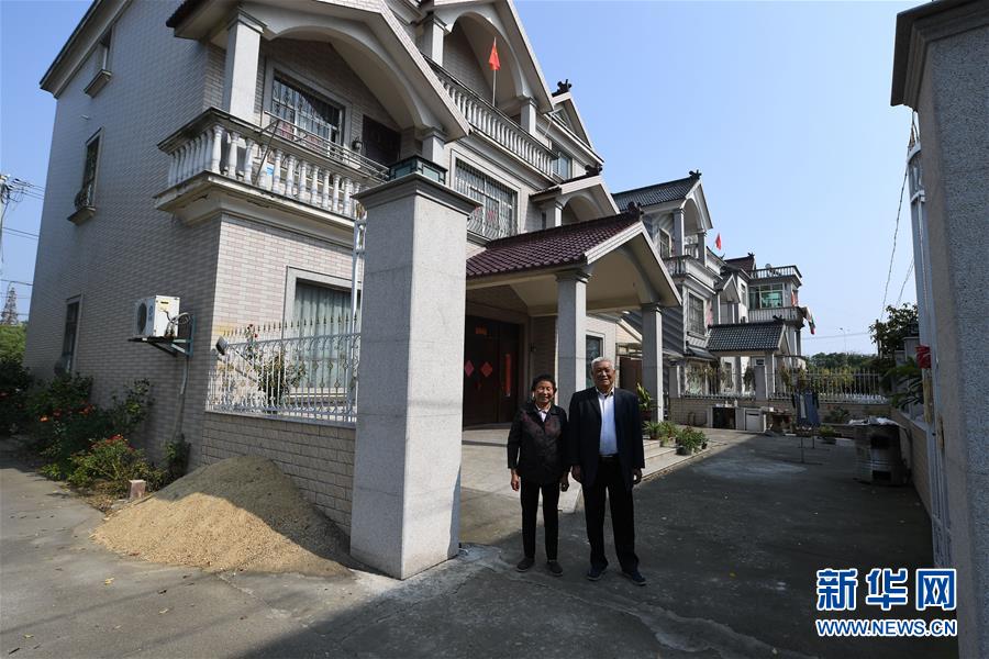 现年72岁的姚苗英(左)与丈夫在自家新修建的楼房前留影(10月23日摄)。姚苗英家的老房因修建公路拆迁,新房是在村里统一规划下新址新建。 新华社记者 季春鹏摄