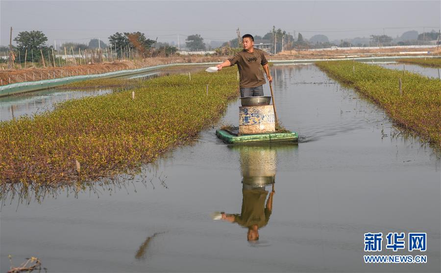 “70后”村民李锦和在自家蟹塘里给螃蟹苗喂食(10月24日摄)。李锦和在开弦弓村经营着近50亩蟹塘,专养螃蟹苗,每天从早上5点就开始忙碌,到了10月份蟹苗上市的季节就更加忙碌了,几乎日夜守护在蟹塘边。开弦弓村90%的水域用于水产养殖,以虾蟹为主。 新华社记者 季春鹏摄