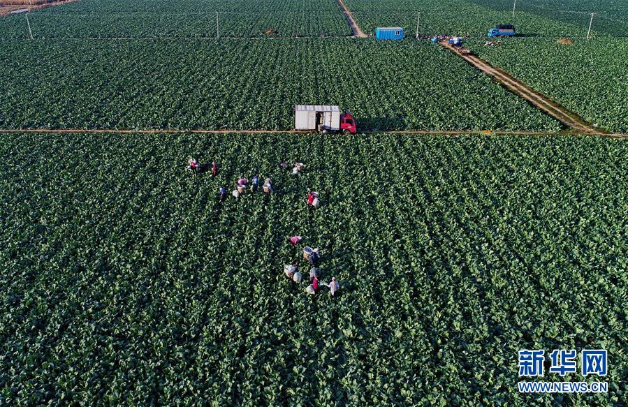 10月29日,乐亭县马头营镇马头营村的农民在收获菜花(无人机拍摄)。 新华社记者杨世尧摄