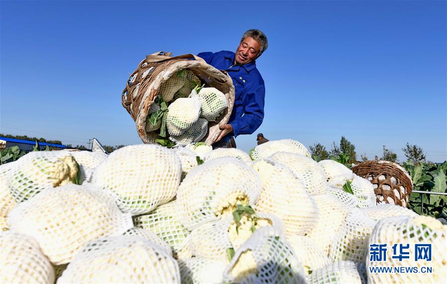 10月29日,乐亭县马头营镇马头营村的农民将收获的菜花装车。 新华社记者杨世尧摄