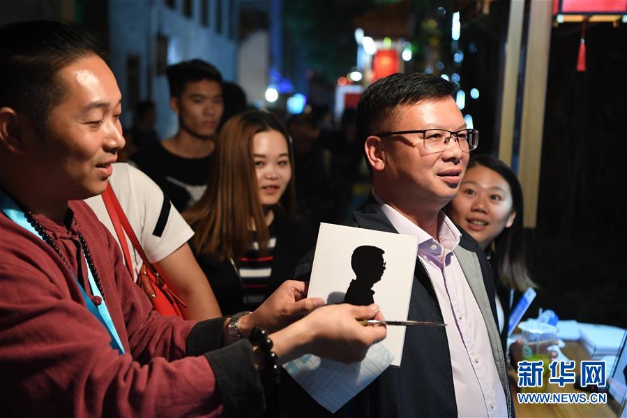 10月29日,在首届天下码商大会码商集市上,一位剪纸艺人(左)在展示为顾客现场创作的肖像剪纸。 10月28日至30日,由福州市政府联合支付宝主办的首届天下码商大会在福建福州举行。 新华社记者 姜克红 摄