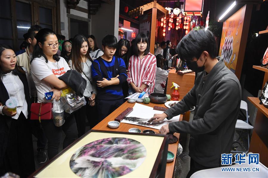 10月29日,在首届天下码商大会码商集市上,观众观看手指作画。 10月28日至30日,由福州市政府联合支付宝主办的首届天下码商大会在福建福州举行。 新华社记者 姜克红 摄