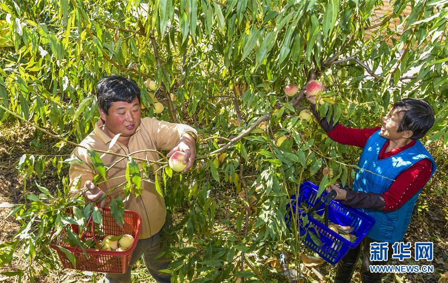 10月29日,河北省故城县盛嘉庄园的工作人员在采摘冬桃。 新华社记者 李晓果 摄