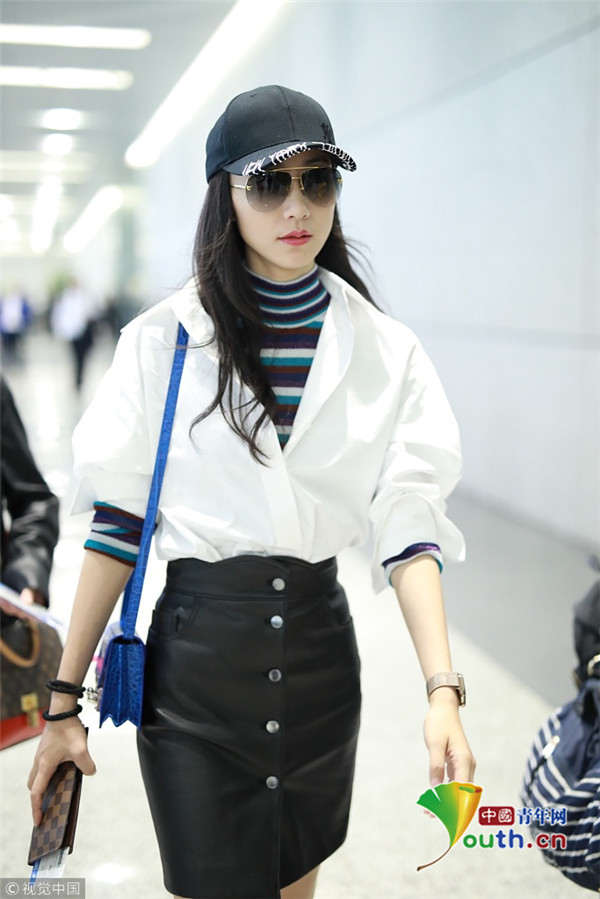韩雪衬衫短裙清新养眼 帅气迈步自提行李亲和力足