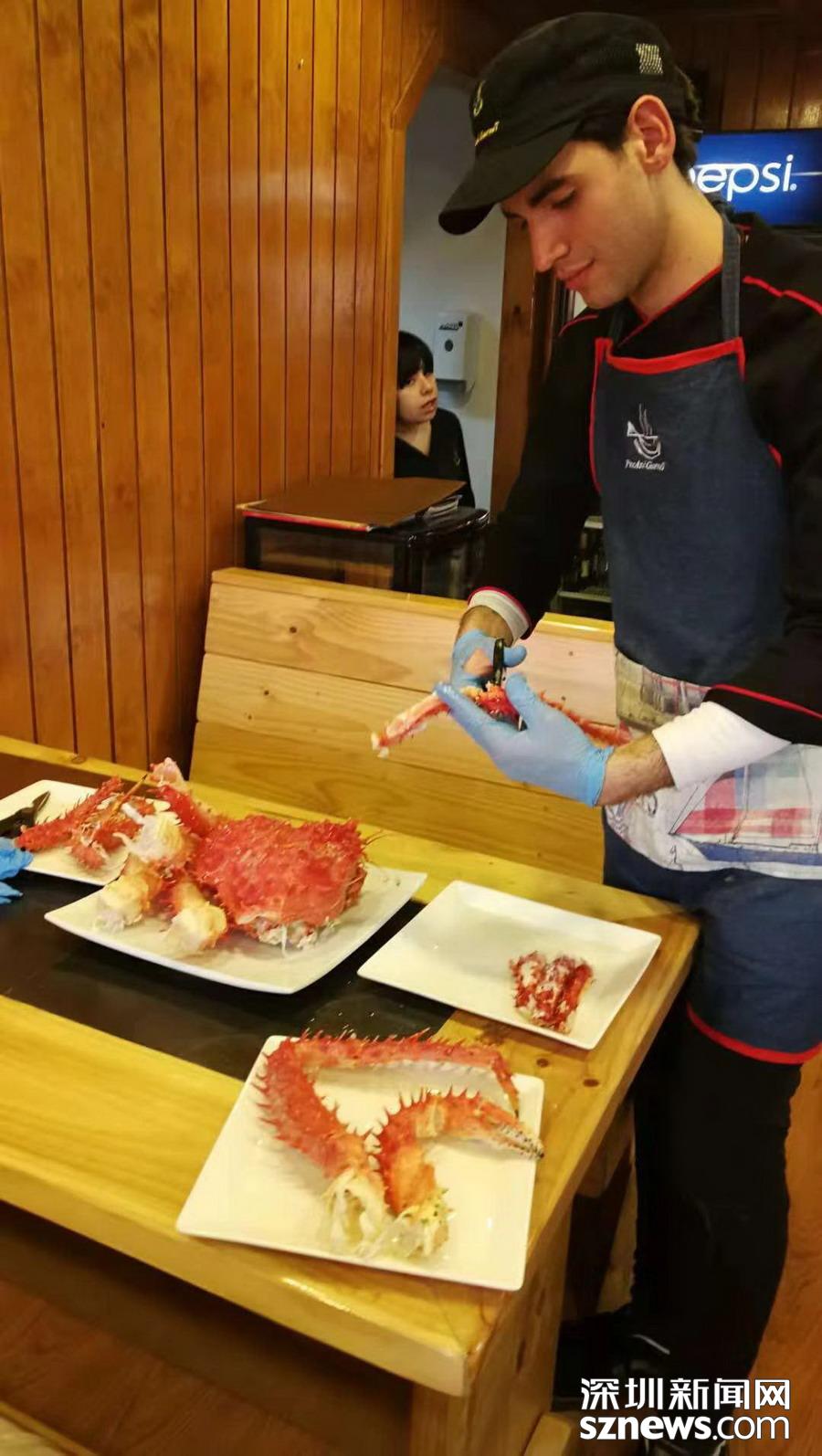 深圳新闻网讯 蜘蛛蟹(又名皇帝蟹)只产于南北两极冰冷的海洋中,因为八条腿特长,外观形似蜘蛛,而且触角也比普通螃蟹多,所以被称为蜘蛛蟹,大个的重量可达5公斤以上。智利政府规定,小于1.5公斤的不许捕捞。