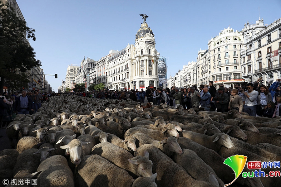 当地时间2018年10月21日,西班牙马德里,西班牙牧羊人驱赶成百上千只绵羊穿越马德里市街,展示古老的游牧习俗。这项活动是为了捍卫承袭自古代的“牧羊权”,并且抗议现代生活方式以及都市化,侵害牧民的权益。