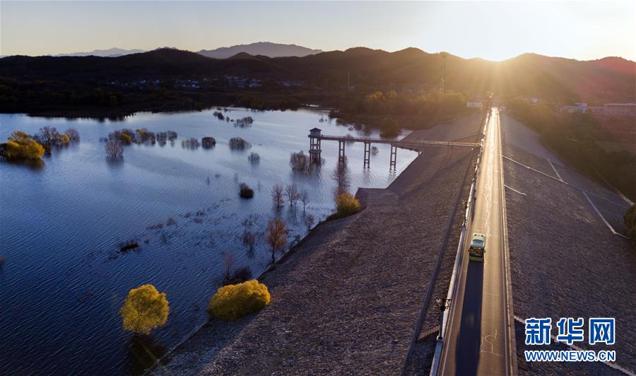 10月30日,一辆汽车行驶在北京密云水库的大坝上(无人机拍摄)。