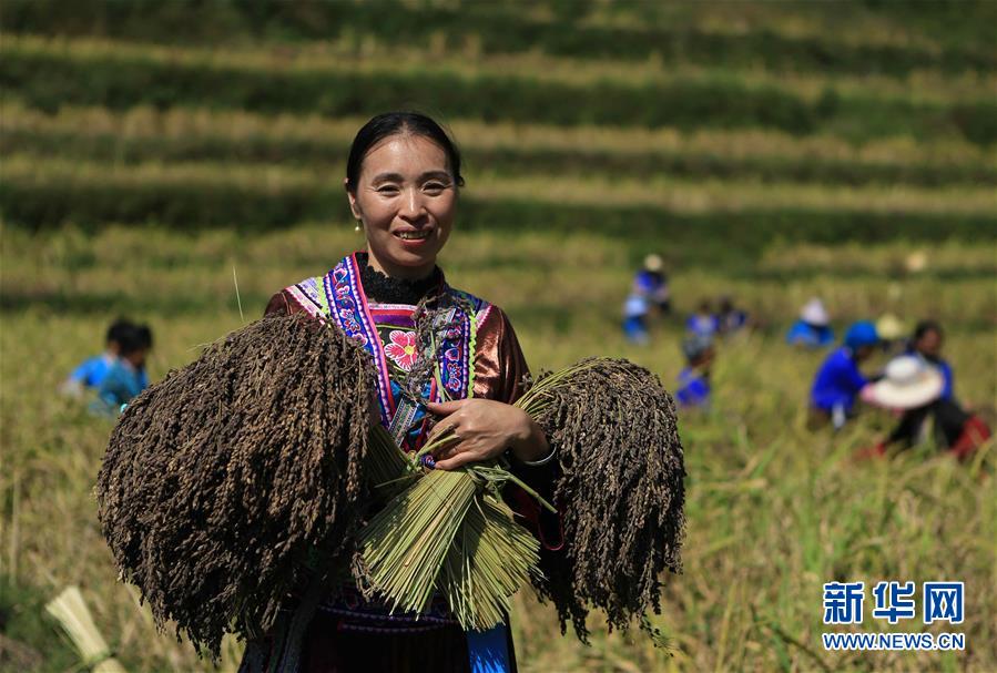 10月30日,在广西融水苗族自治县安太乡元宝村,合作社负责人谢秀萍在展示刚刚收获的香糯。 新华社记者 吴建路 摄