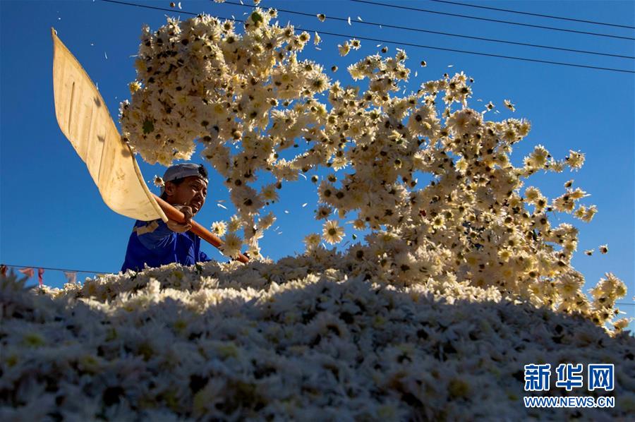 10月30日,武安市午汲镇东河下村村民在晾晒菊花。 新华社记者 王晓 摄