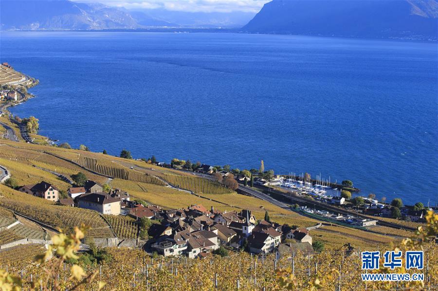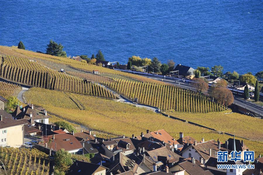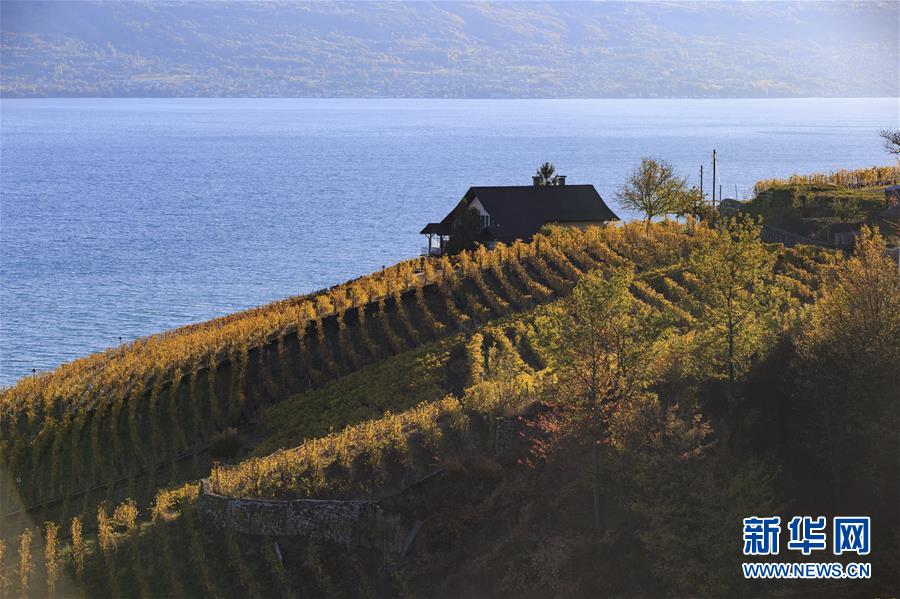 这是10月30日在瑞士西部拉沃地区拍摄的梯田式葡萄园秋景。