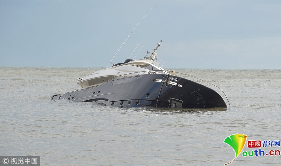 图为一艘船只被暴风雨袭击后倾覆在海面。