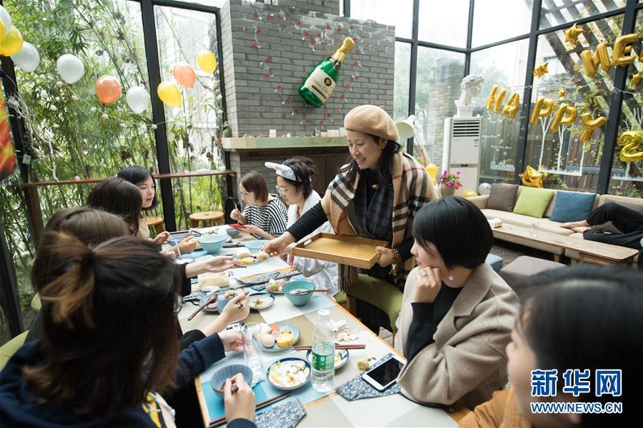 在浙江省杭州市外桐坞村,民宿主人庞代君(右三)在她创立于2016年的“画·乡院”精品民宿为客人送早餐(2018年1月3日摄)。外桐坞村是西湖西面群山中的一个小村落,传统以茶叶生产为主要经济来源,自2010年以来着力打造艺术村落,目前已拥有艺术家工作室43个、高档民宿7家、美术馆和展厅3家。新华社记者 翁忻旸 摄