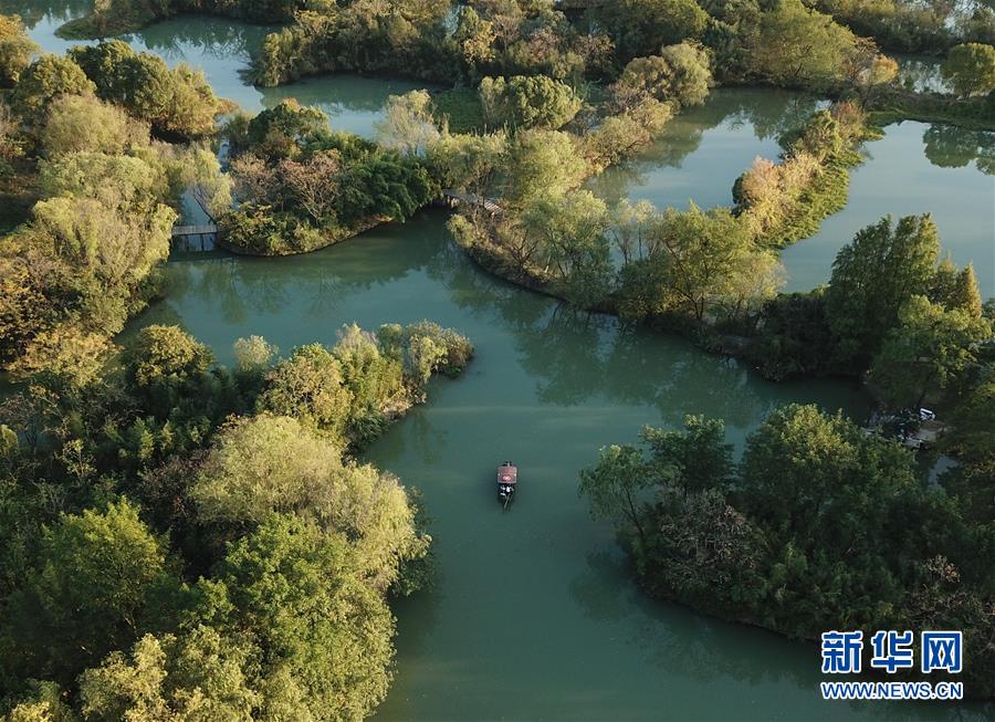 10月29日,游船行驶在西溪湿地河道上(无人机拍摄)。 新华社记者翁忻旸摄