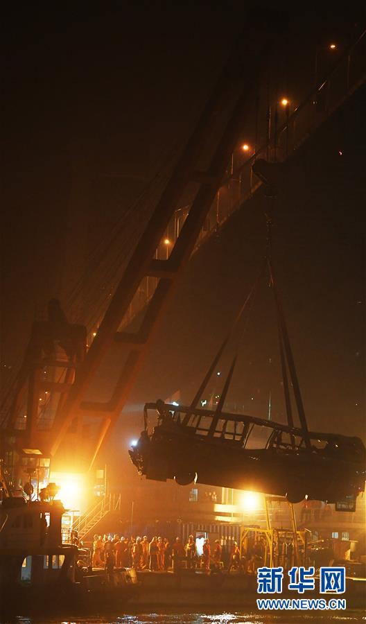 10月31日23时30分左右,记者在重庆万州江面的打捞现场看到,随着浮吊船的吊索缓缓提升,坠江的公交车被打捞出水面。 10月28日10时8分,重庆市万州区一辆公交车行驶至长江二桥时,与一辆小轿车相撞后坠江。经公安机关初步核实,失联人员15人。